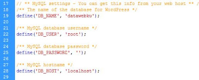 Pengaturan yang kita lakukan seperti yang ditunjukkan pada gambar di atas adalah pengaturan pada localhost. Sehinnga, agar nantinya website kita bisa dibuka, kita harus merubah pengaturan konfigurasi tersebut sesuai dengan webserver dimana kita akan meng-hosting-kan website kita secara online. Sekarang kita akan mengganti setting configuaration pada website Wordpress CMS yang kita buat pada localhost dengan menggunakan informasi yang telah kita dapatkan dari langkah 3 dan langkah 5 agar sesuai dengan hosting online. Silahkan buka  file website Anda yang ada di "C:\xampp\htdocs\webku" (sesuai dengan nama folder website yang Anda instal). Cari file yang bernama "wp-config.php", kemudian buka file tersebut menggunakan notepad, wordpad, atau dreamweaver.