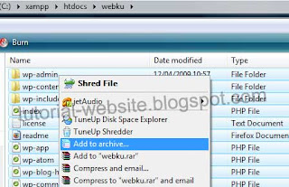 Kita akan menggunakan cara  yang kedua agar lebih mudah dan tidak menghabiskan waktu yang banyak mengingat file Wordpress CMS milik kita sangat banyak. Untuk itu, kita harus menyimpan terlebih dahulu file-file website Wordpress CMS kita ke dalam salah satu bentuk archive tersebut. Sebagai contoh kita kompress ke dalam bentuk .zip. Buka file website Anda yang ada di "C:\xampp\htdocs\webku". Perlu diperhatikan bahwa yang akan kita kompress bukanlah folder "webku" secara langsung, tetapi isi dari foder "webku" agar website akan langsung terlihat ketika dibuka melalui domain yang digunakan, dan tidak lagi membuka folder "webku".